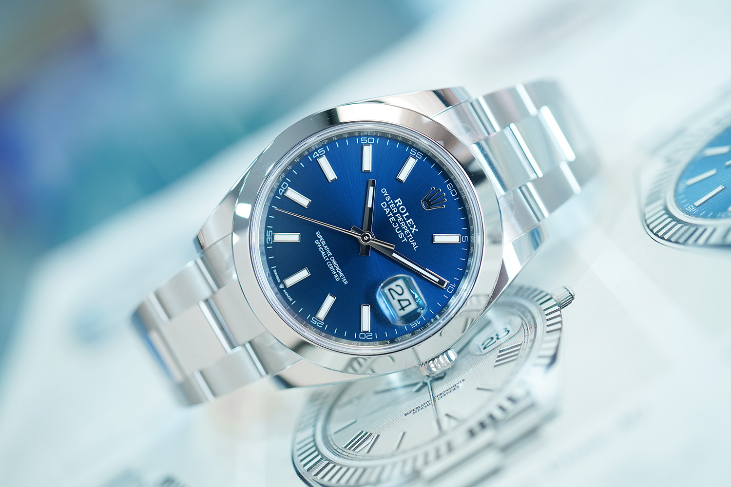 -ของใหม่มือ 1 ไม่เคยใช้งาน หน้าปัดน้ำเงิน ขนาด 41 mm ขอบเรียบ หลักขีด เครื่องรุ่นใหม่ Cal.3235 สำรองพลังงาน 70 ชม. สาย Oyster