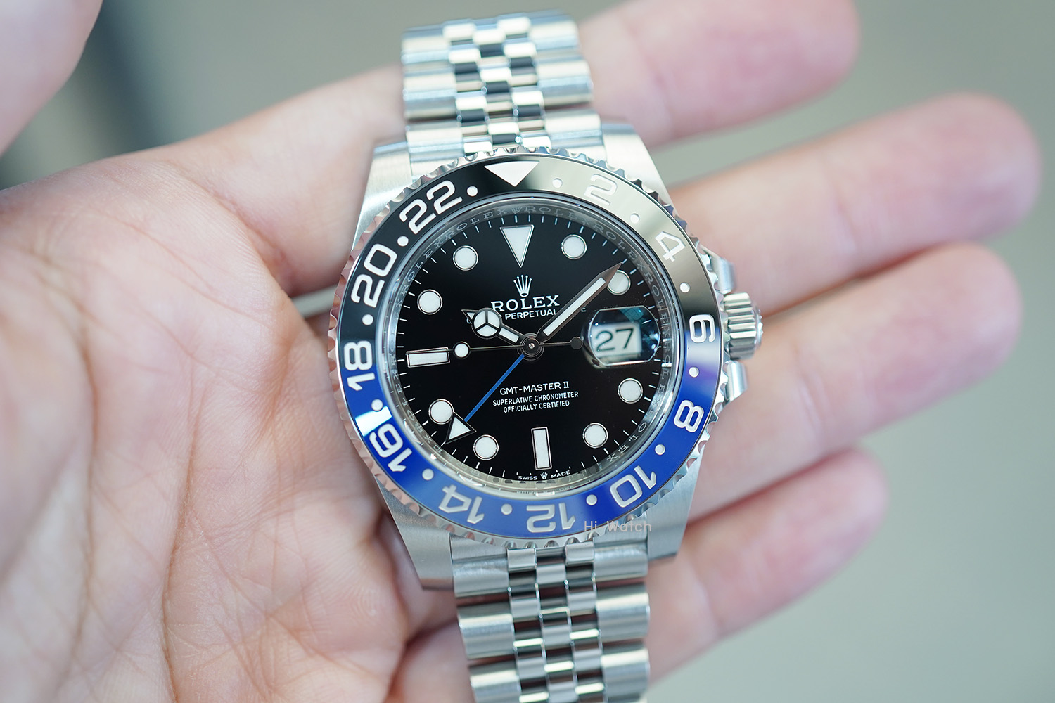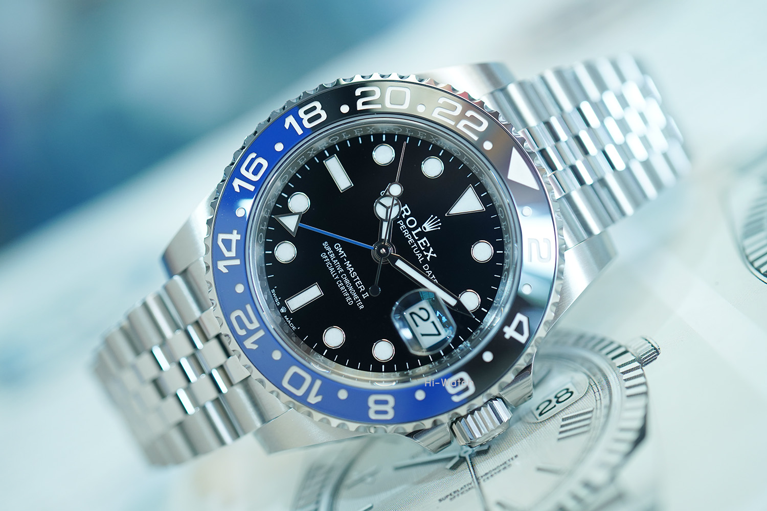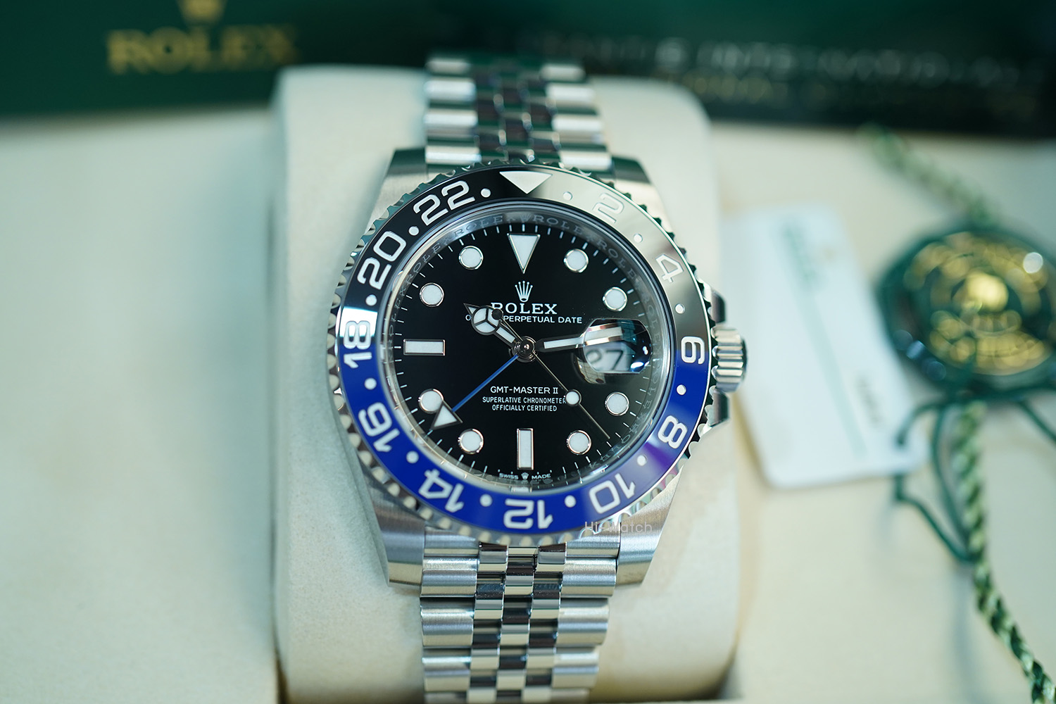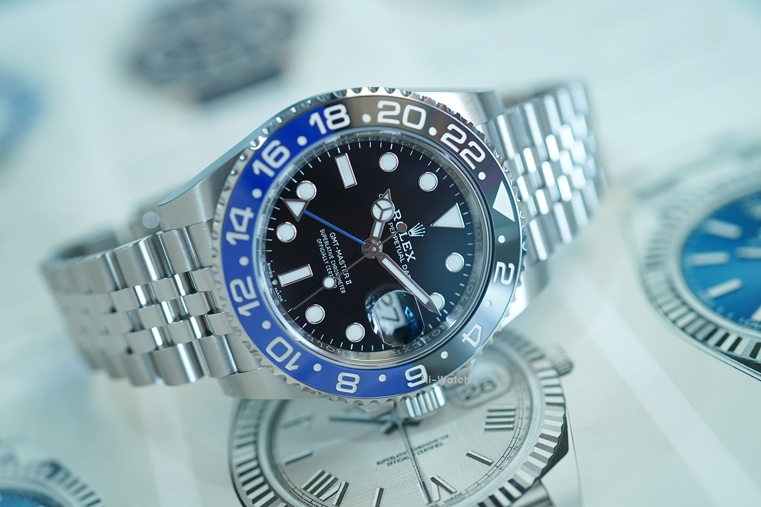 -หน้าปัดดำ ขนาด 40 mm ขอบเซรามิคน้ำเงินดำ (Batman) เครื่อง GMT รุ่นใหม่ Cal.3285 สำรองพลังงาน 70 ชม. สายจูบิลี่ บัคเคิลบานพับข้อกลางเงา