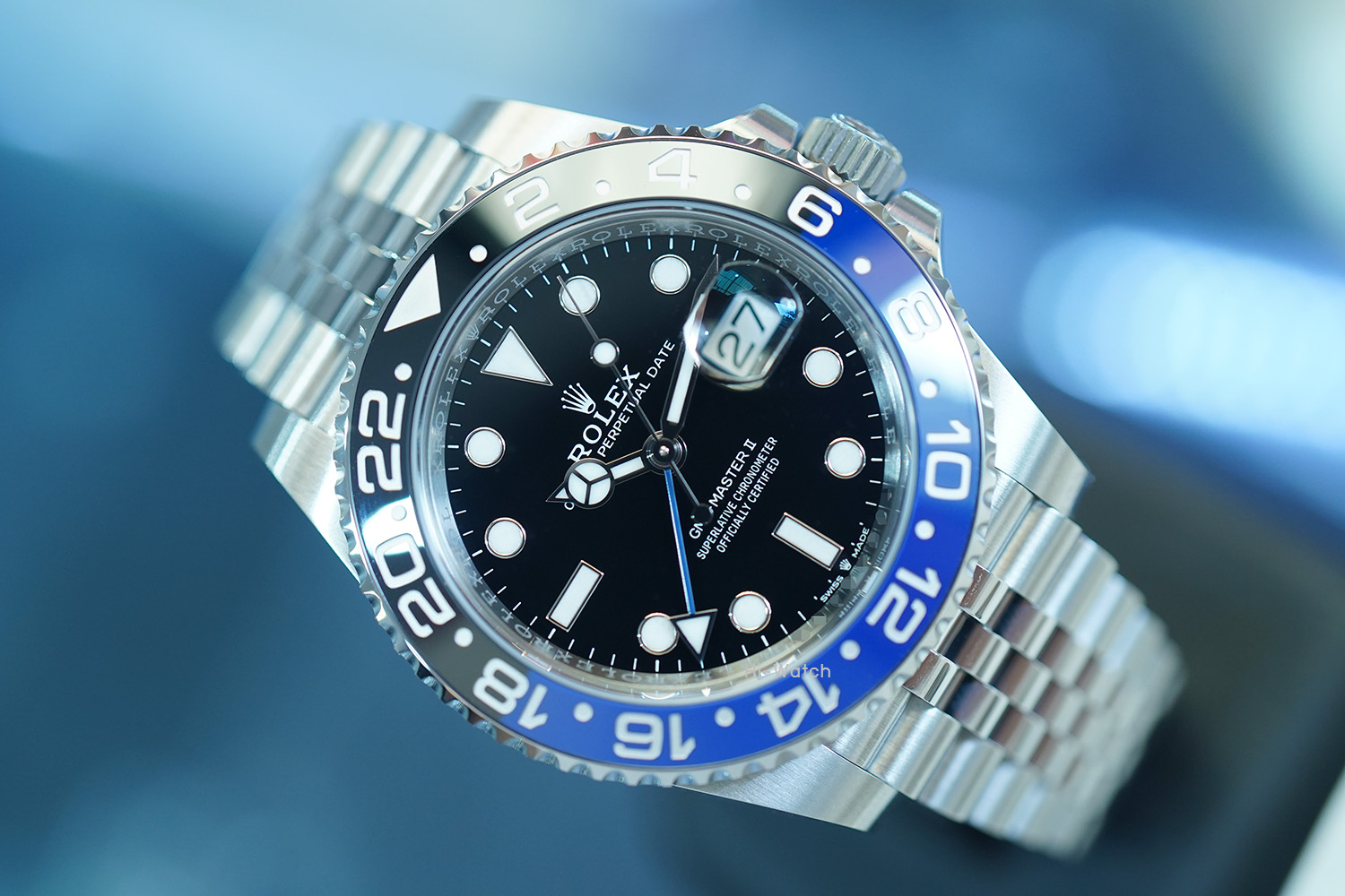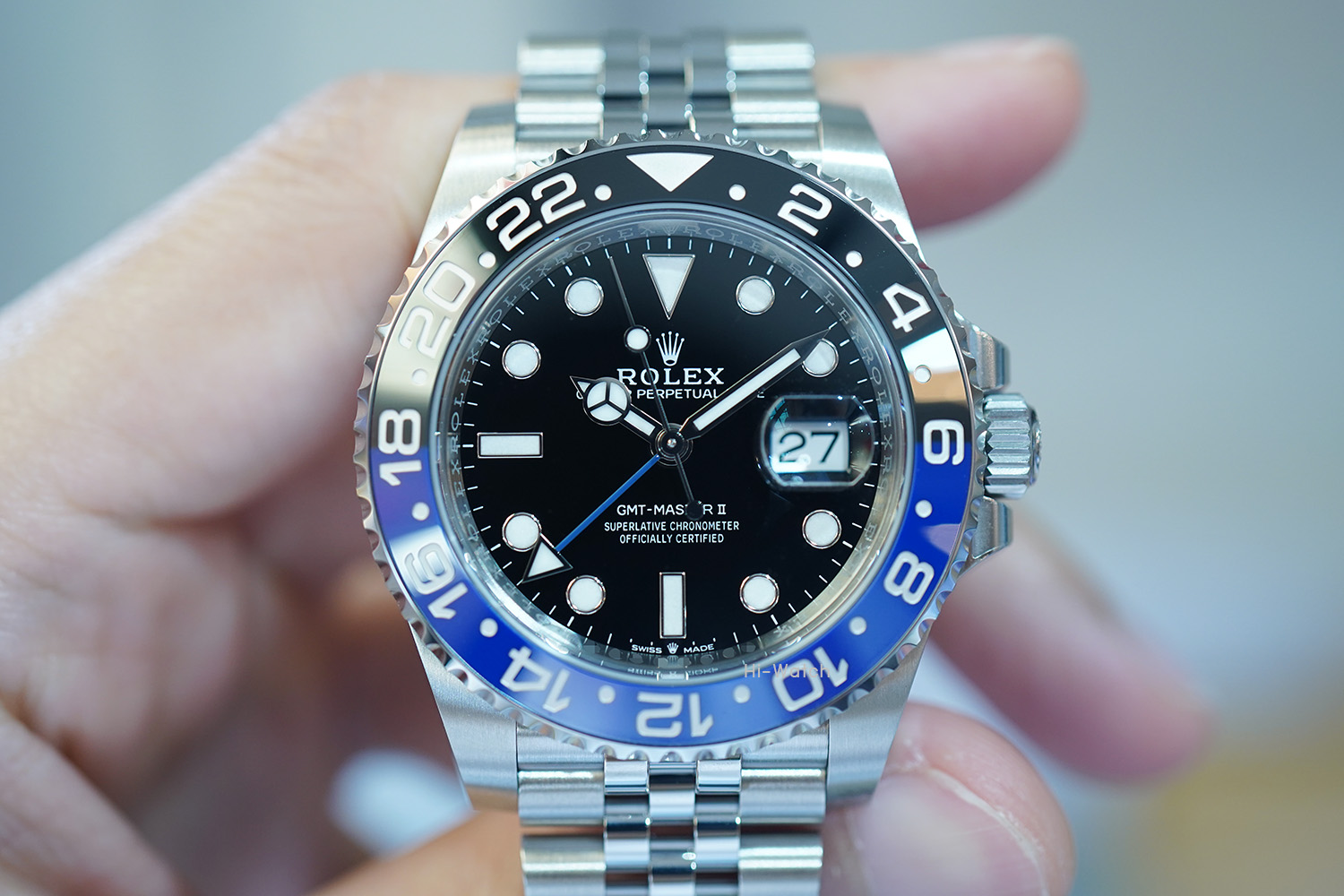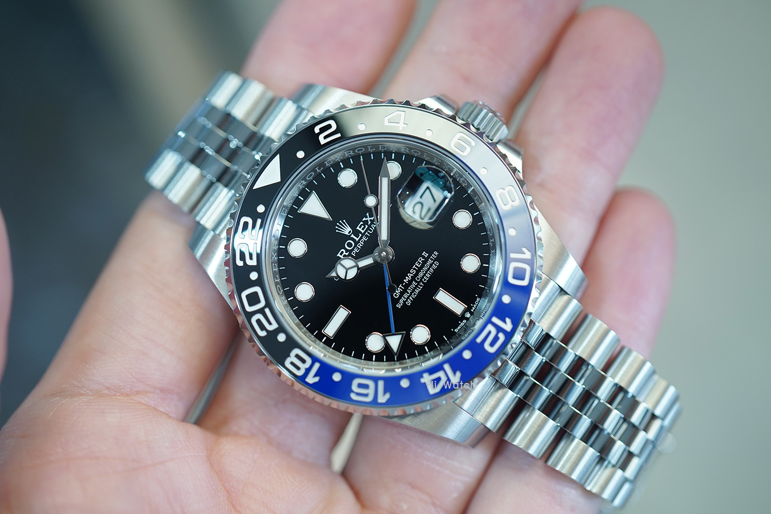 -หน้าปัดดำ ขนาด 40 mm ขอบเซรามิคน้ำเงินดำ (Batman) เครื่อง GMT รุ่นใหม่ Cal.3285 สำรองพลังงาน 70 ชม. สายจูบิลี่ บัคเคิลบานพับข้อกลางเงา