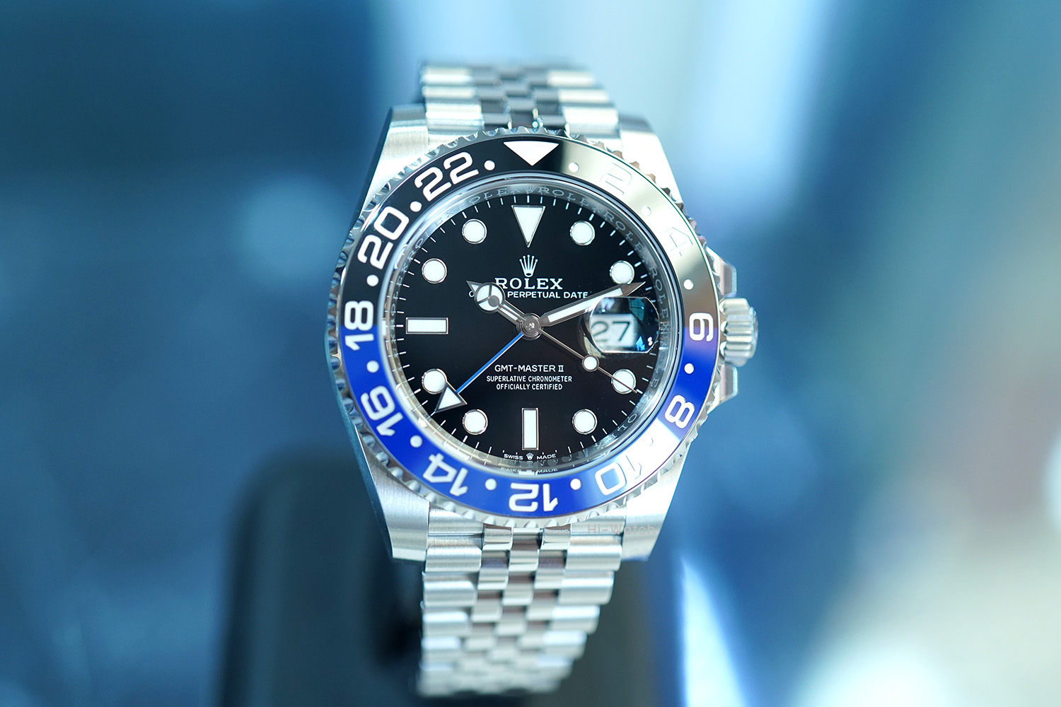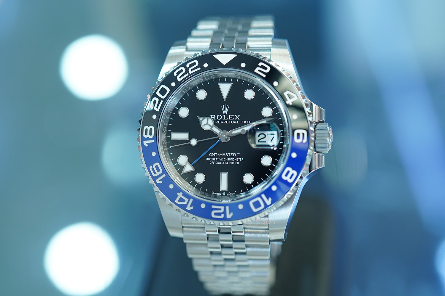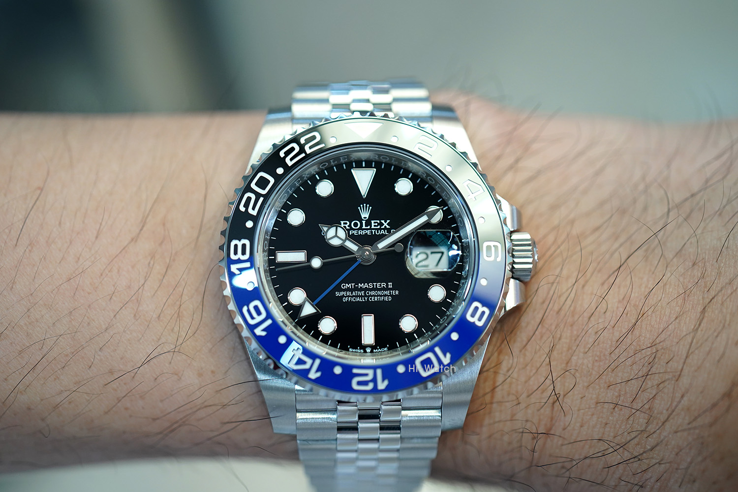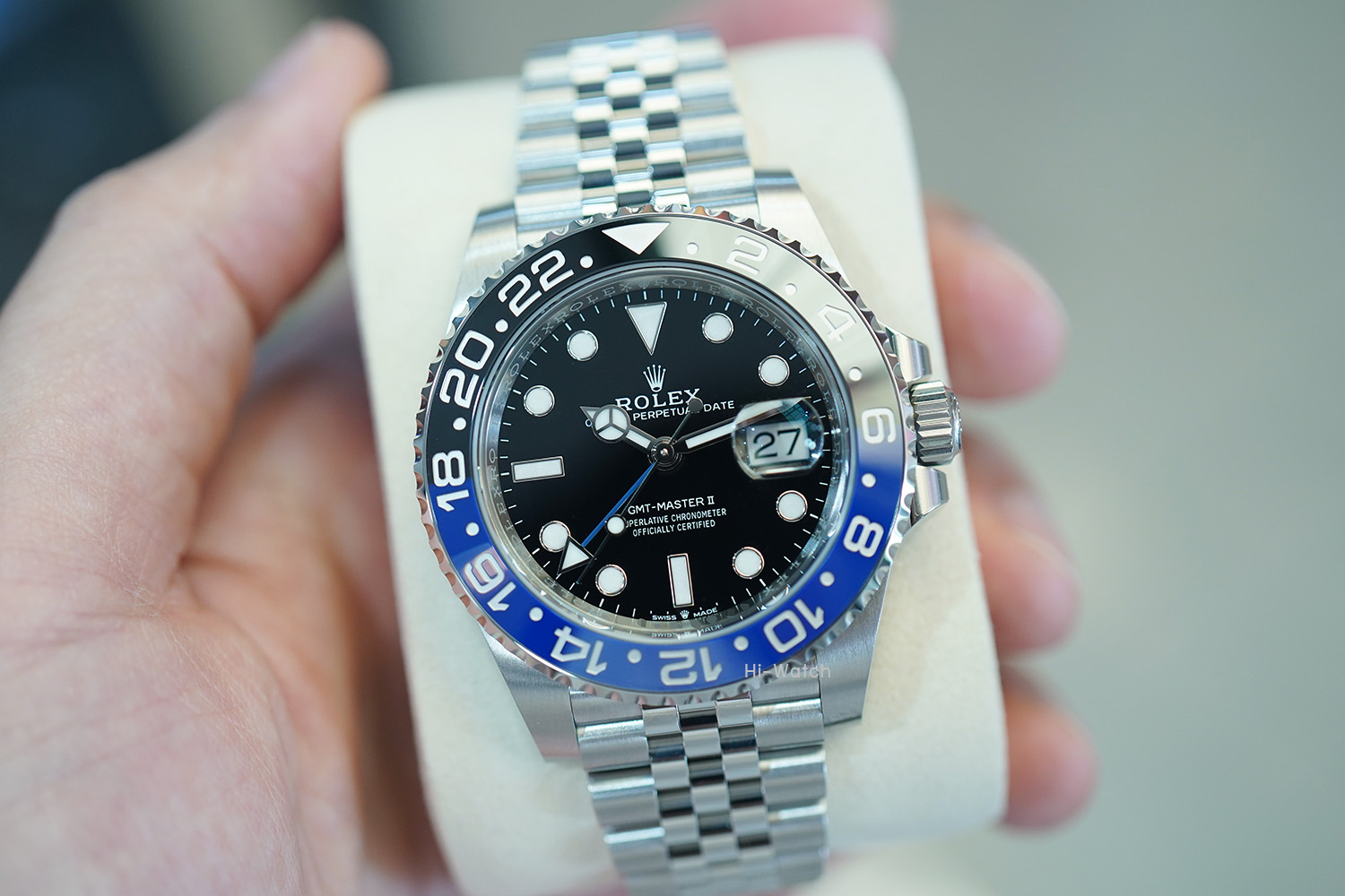 -หน้าปัดดำ ขนาด 40 mm ขอบเซรามิคน้ำเงินดำ (Batman) เครื่อง GMT รุ่นใหม่ Cal.3285 สำรองพลังงาน 70 ชม. สายจูบิลี่ บัคเคิลบานพับข้อกลางเงา