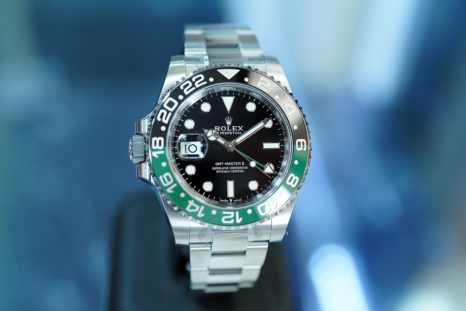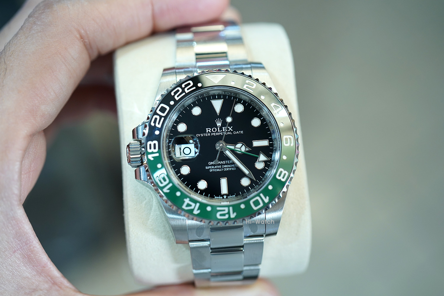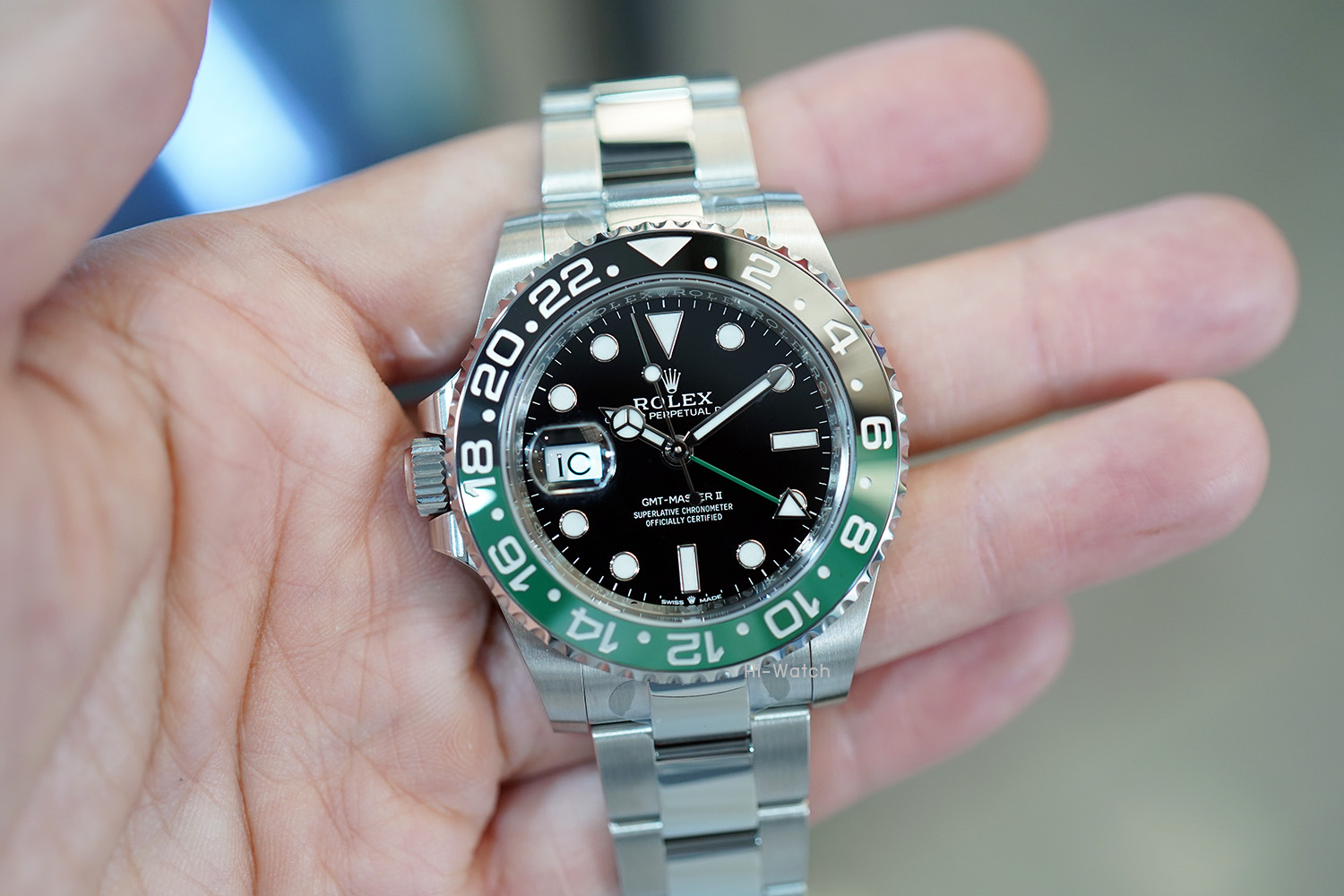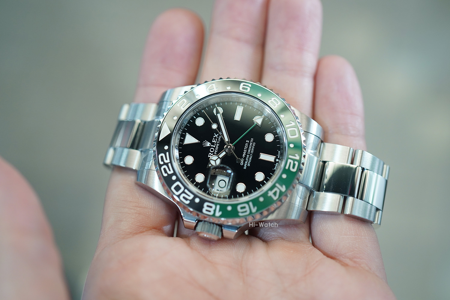 -หน้าปัดดำ ขนาด 40 mm เม็ดมะยมด้านซ้าย ขอบเซรามิคดำ/เขียว เครื่อง GMT รุ่นใหม่ Cal.3285 สำรองพลังงาน 70 ชม. สาย Oyster