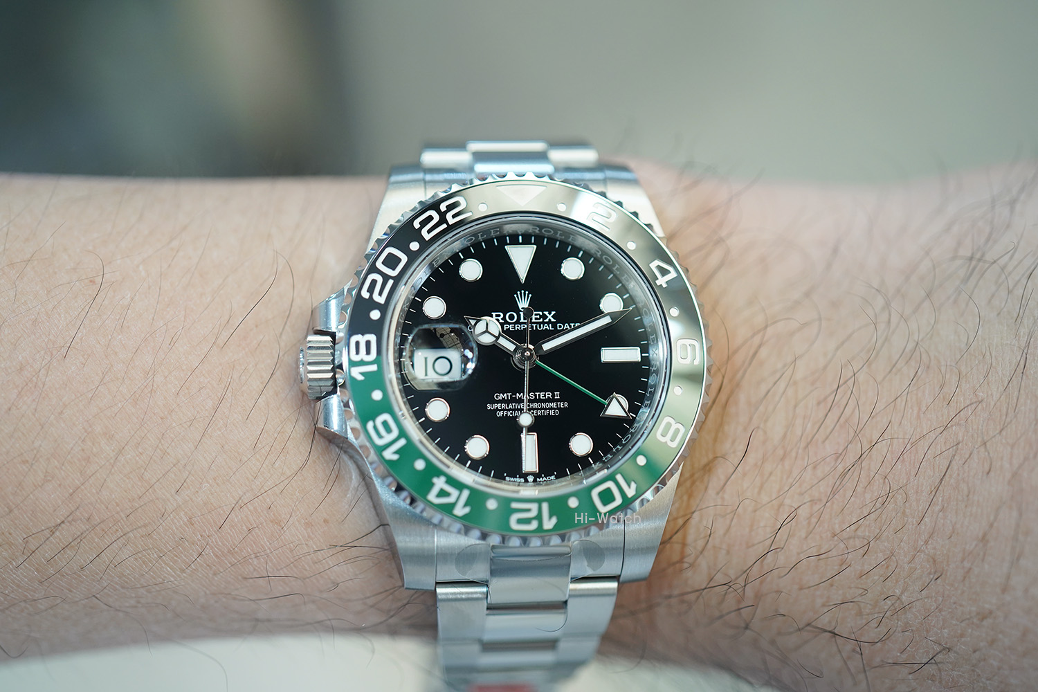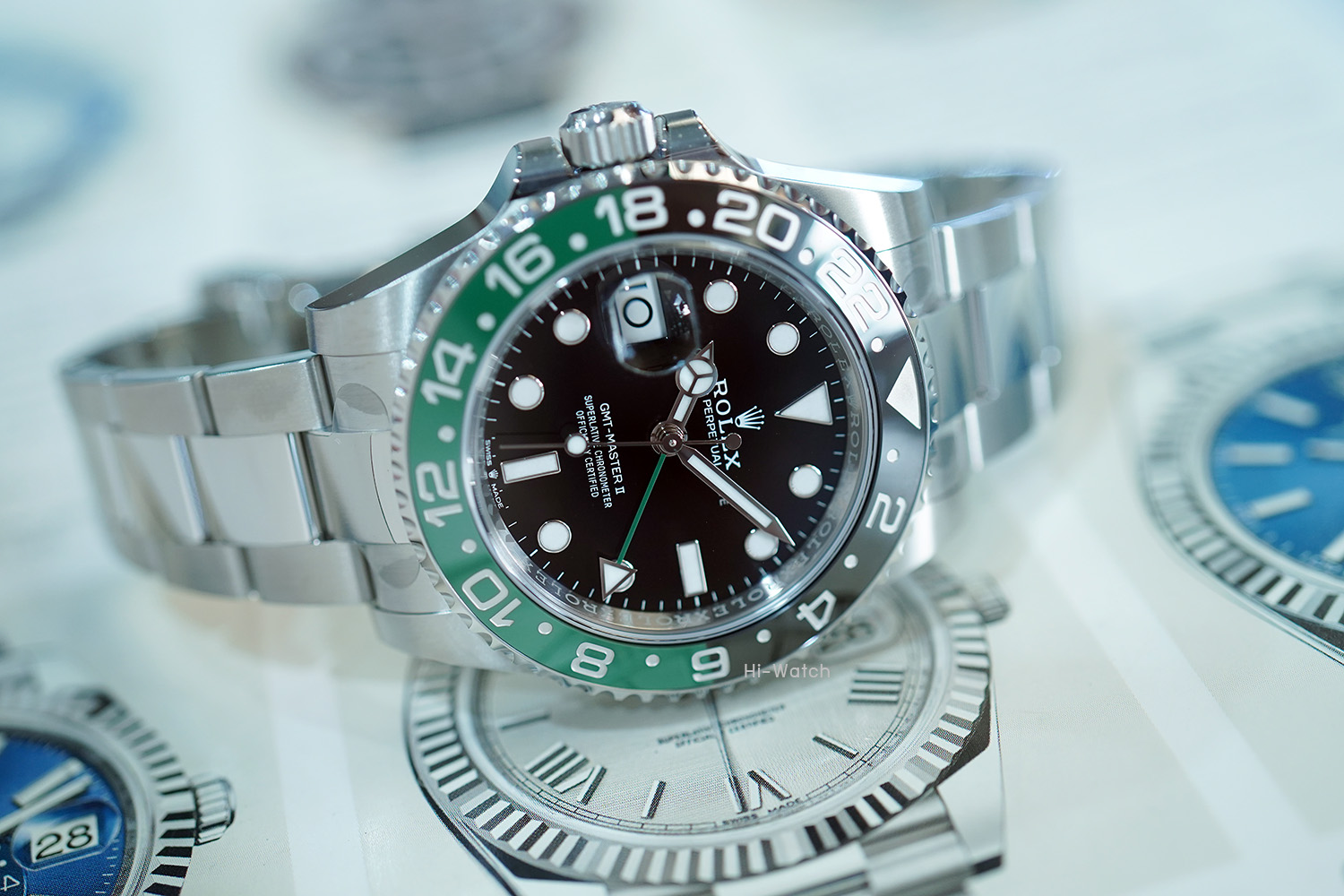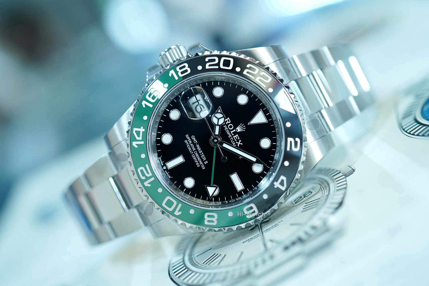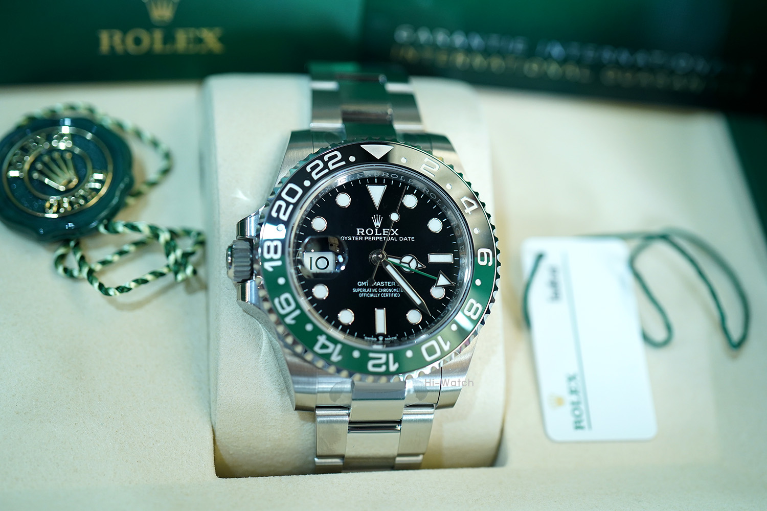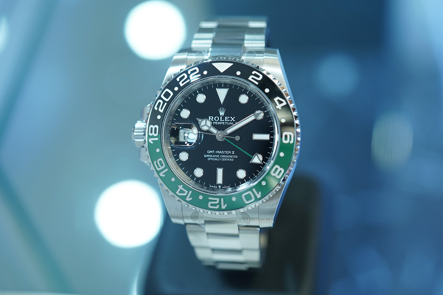 -หน้าปัดดำ ขนาด 40 mm เม็ดมะยมด้านซ้าย ขอบเซรามิคดำ/เขียว เครื่อง GMT รุ่นใหม่ Cal.3285 สำรองพลังงาน 70 ชม. สาย Oyster