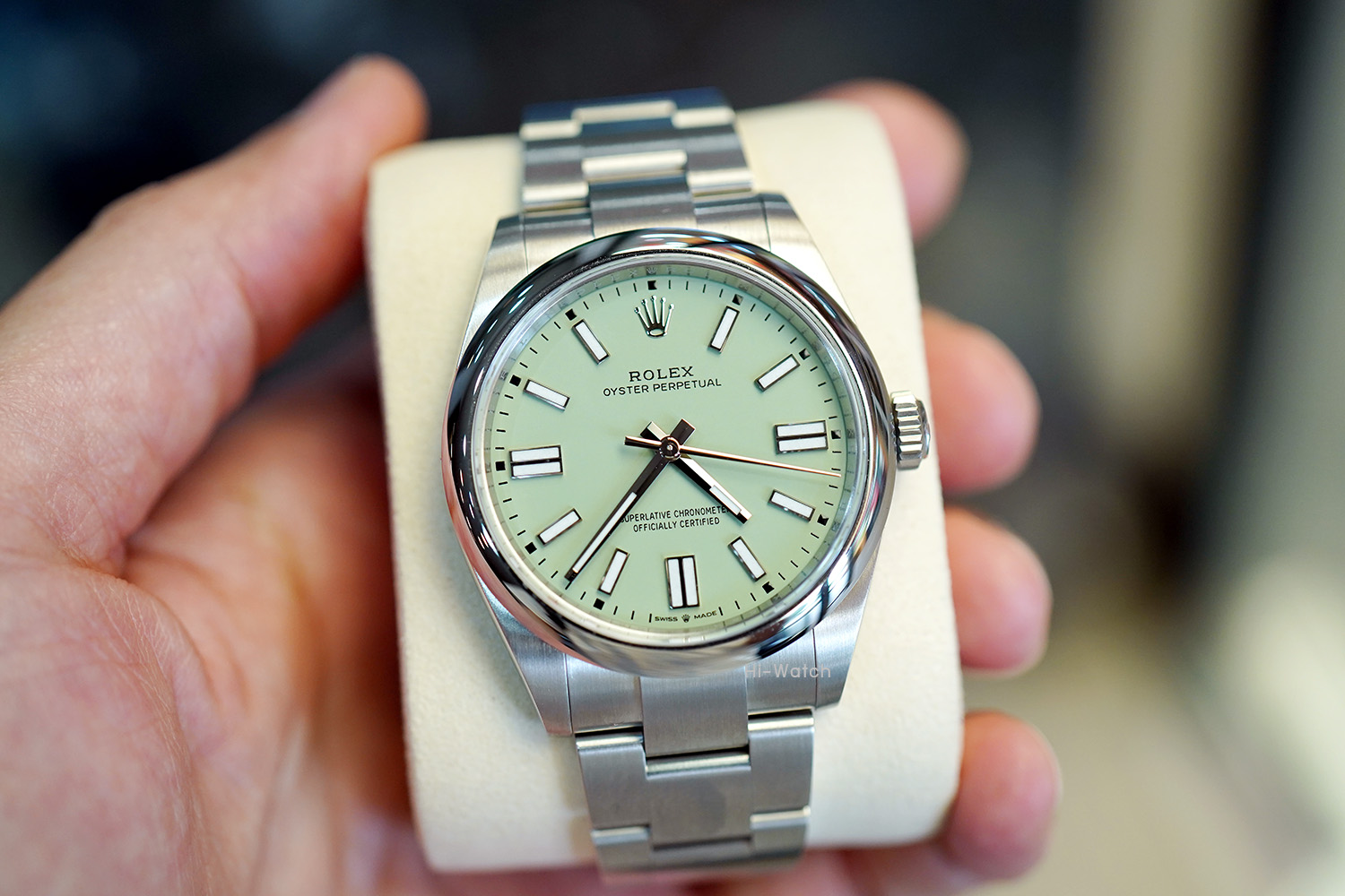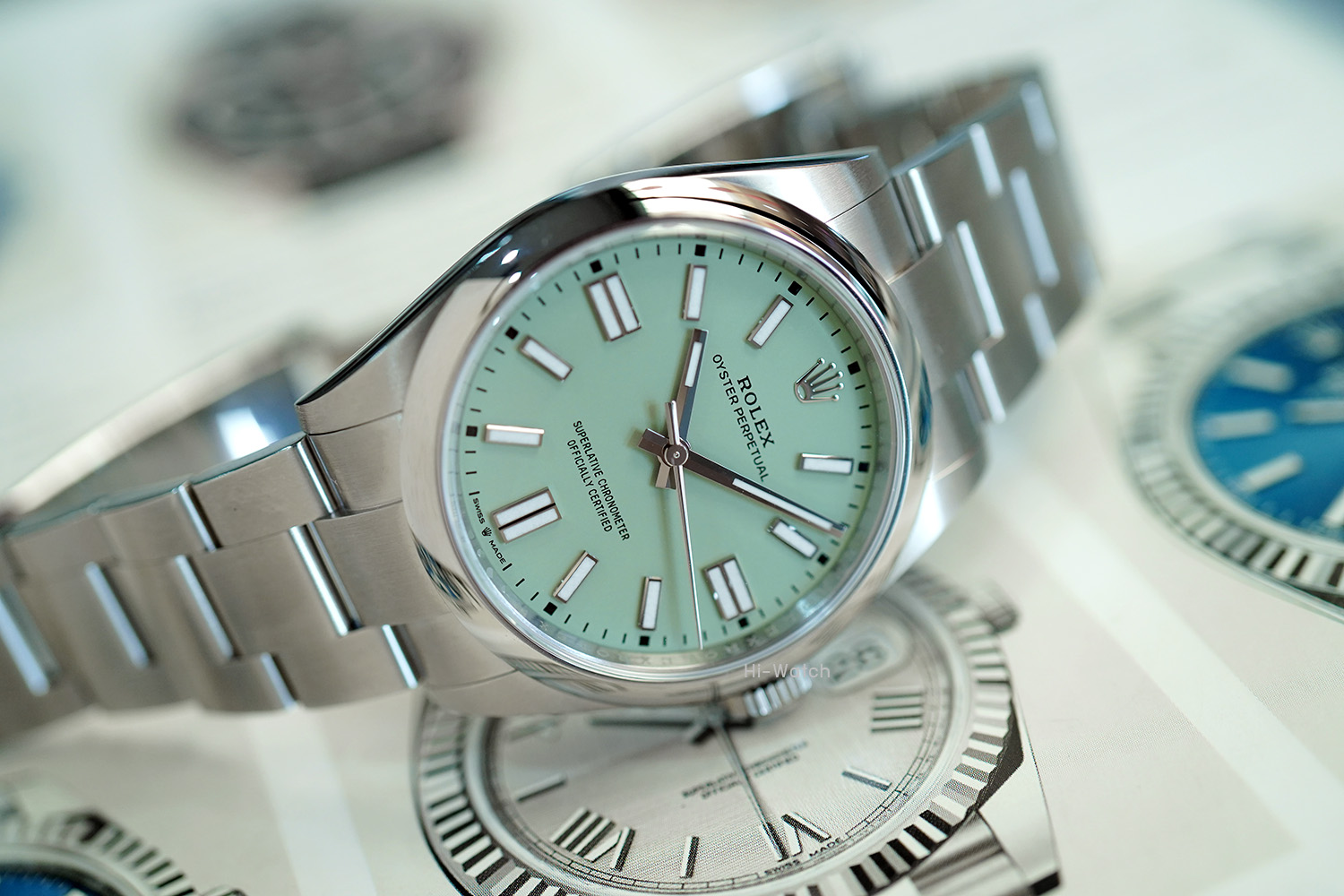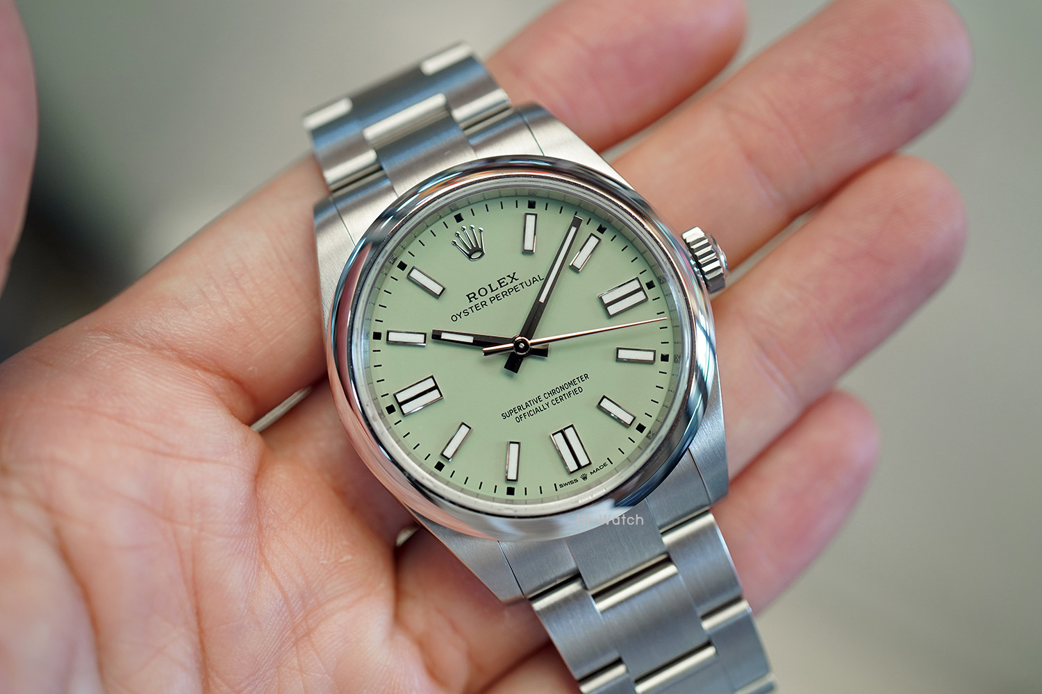 -ของใหม่มือ 1 ไม่เคยใช้งาน หน้าปัดสี Pistachio ขนาด 41 mm เครื่อง Auto รุ่นใหม่ Cal.3230 สำรองพลังงาน 70 ชม. สายขัดด้าน ชุดตัวล็อก Oysterclasp แบบพับได้พร้อมระบบขยายสาย Easylink 5 มม.