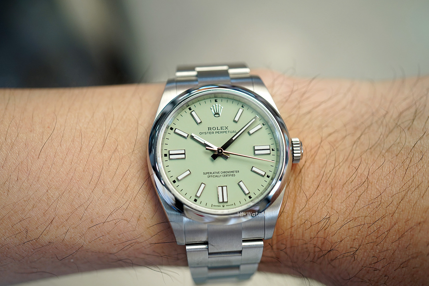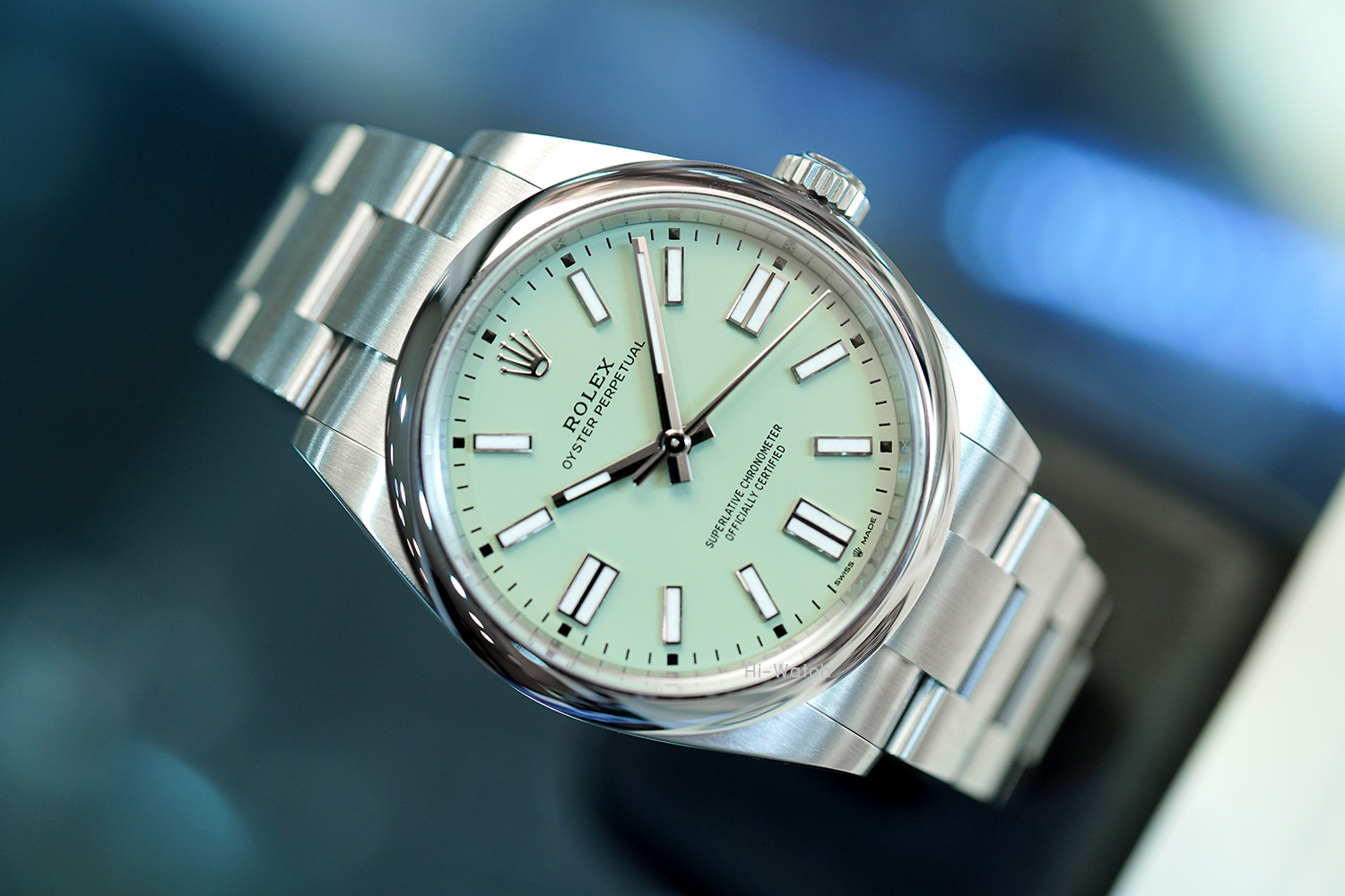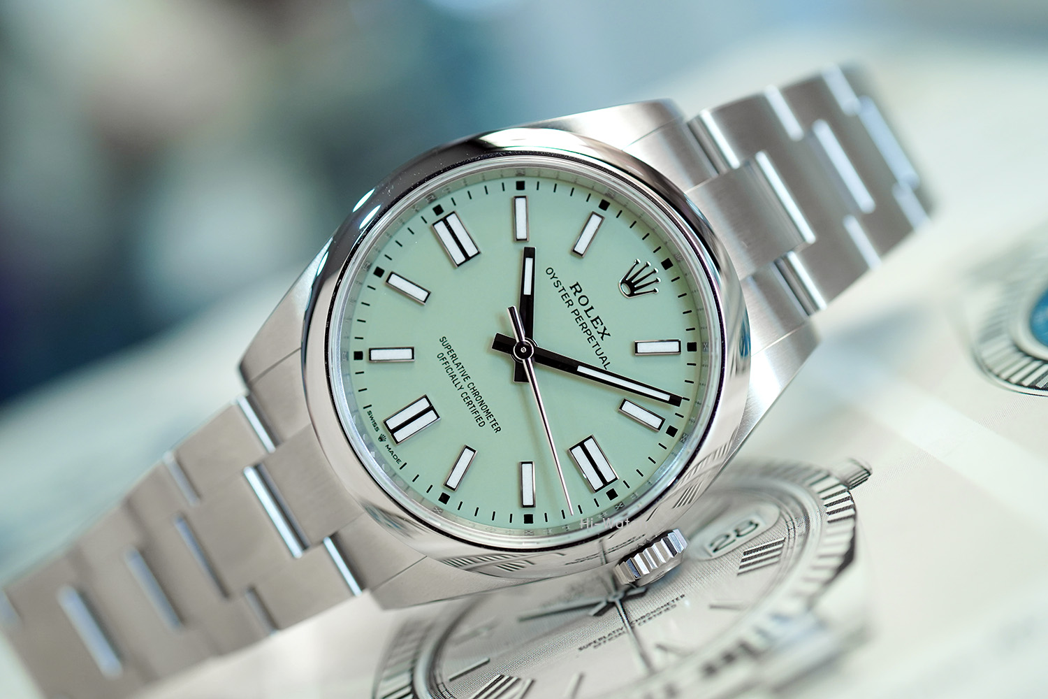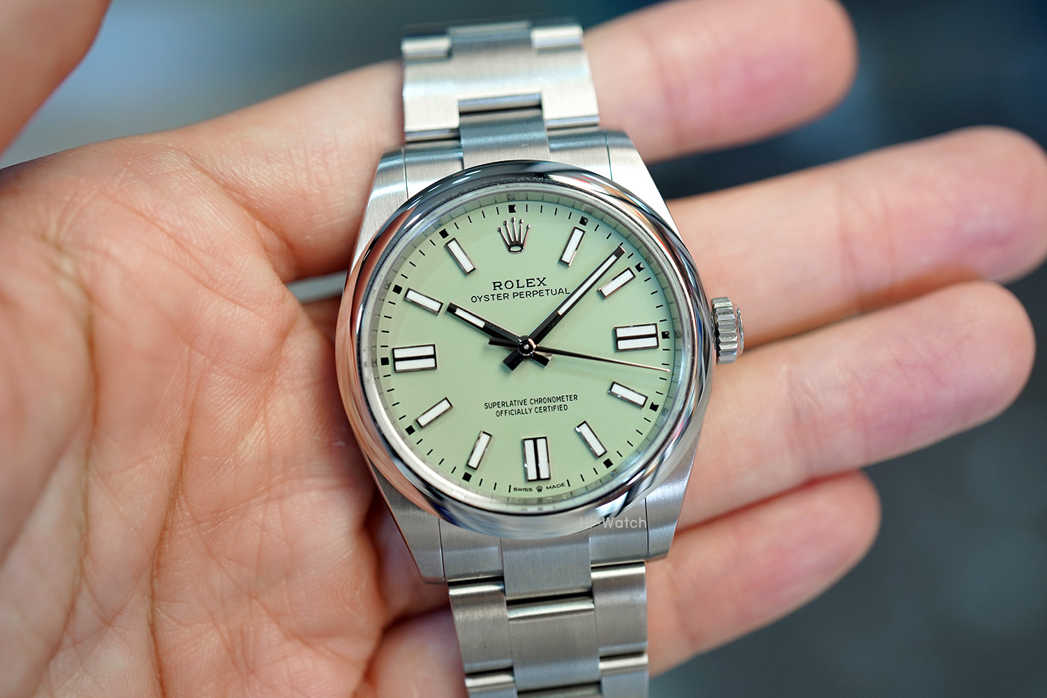 -ของใหม่มือ 1 ไม่เคยใช้งาน หน้าปัดสี Pistachio ขนาด 41 mm เครื่อง Auto รุ่นใหม่ Cal.3230 สำรองพลังงาน 70 ชม. สายขัดด้าน ชุดตัวล็อก Oysterclasp แบบพับได้พร้อมระบบขยายสาย Easylink 5 มม.