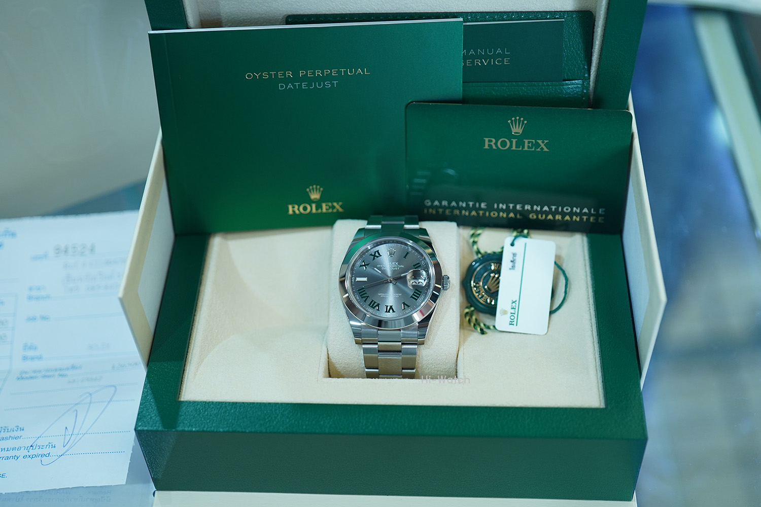 -Used Like New หน้าปัดเทา ขนาด 41 mm ขอบเรียบ หลักโรมันเขียว หรือที่เรียกกันว่าหน้า Winbledon เครื่องรุ่นใหม่ Cal.3235 สำรองพลังงาน 70 ชม. สาย Oyster